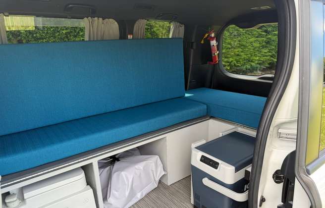 Inside, you’ll find a spacious double bed, LED lighting, convenient under-seat storage, reversing camera and everything you need for cooking on the road: a 2-burner gas stove, butane canisters, pots, pans, utensils, crockery, french press, and more. A 18L 12v fridge box is powered by an auxiliary battery that recharges as you drive, and even better, the solar panel charges both the house and vehicle battery, helping keep your setup powered for longer, wherever you roam.